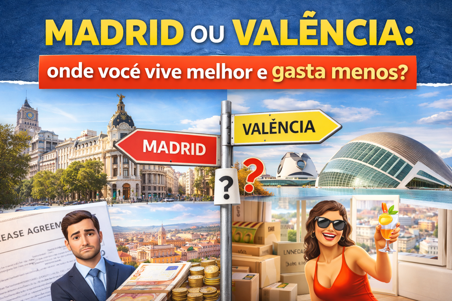 Você está pensando em mudar para a Espanha e quer comparar Madrid e Valência? Neste guia prático eu te mostro aluguel (ex.: 900–1.500€/mês em Madrid, 700–1.200€ em Valência), alimentação (200–350€/mês), transporte e dicas para economizar como bilhetes mensais e mercados locais.
